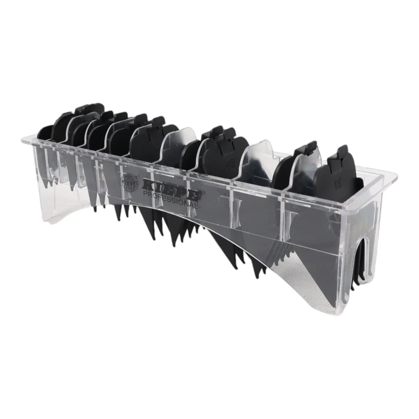 Elevate your haircutting precision with the Kiepe Clipper Attachment Comb Guard Set 633.1, a comprehensive 10-piece set designed to enhance the versatility of your Kiepe Professional clippers. Offering a range of cutting lengths from 1.5mm to 25mm, this set is ideal for both professional barbers and home grooming enthusiasts. Each comb is crafted from high-quality, durable plastic and measures 45.5mm by 38.5mm, ensuring a secure fit and consistent performance with every use. The finely rounded tips provide added protection for the scalp, allowing for a smooth, comfortable cutting experience.