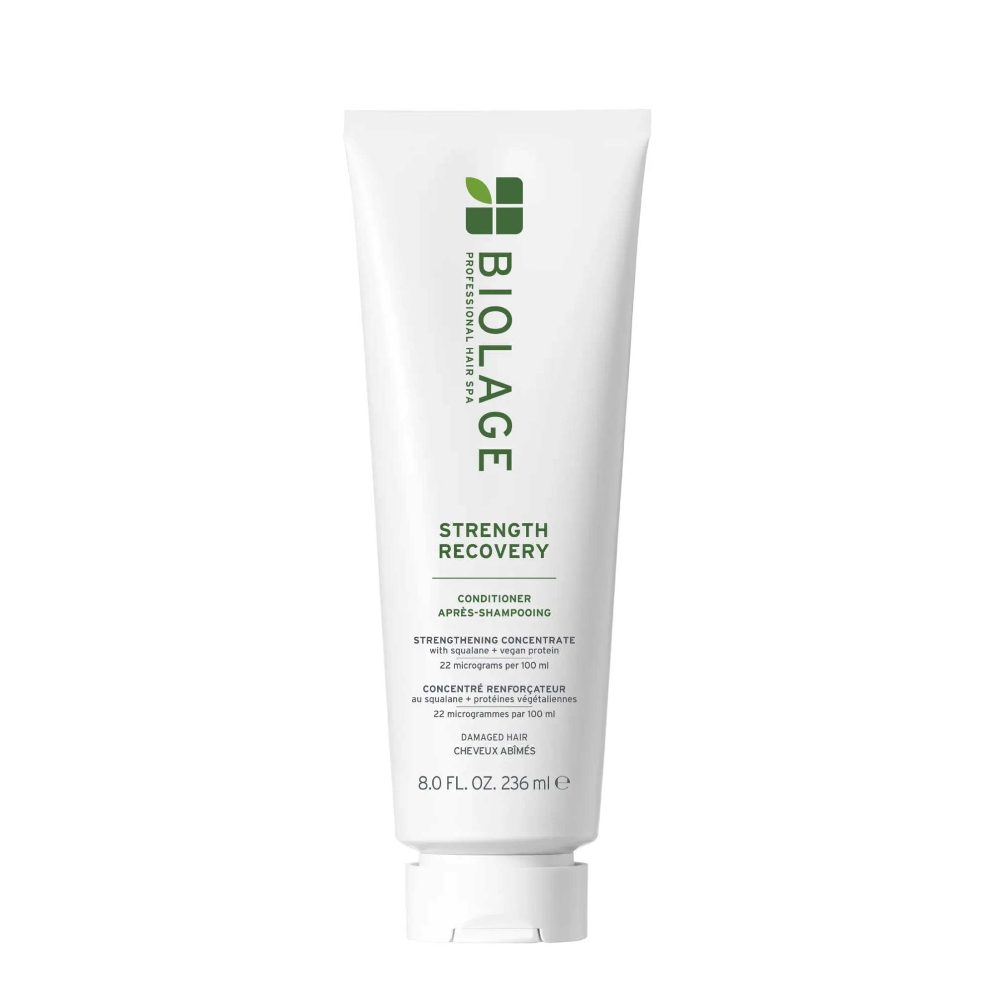 Strength Recovery Conditioning Cream infused with vegan squalane is a rinse-off conditioner for damaged hair that strengthens and moisturizes.
